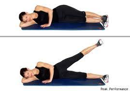 Zvedání dolních končetin během těhotenství: Zvedání nohou využívá váhu vašeho těla k posílení stehenních svalů (žádné vybavení z reklam netřeba). Úplně jednoduše si lehněte na levý bok a srovnejte do linie rameno, boky a kolena. Poté pomalu zvedejte pravou nohu do takové výšky, jež je vám pohodlná (nezapomínejte dýchat). Udělejte deset opakování a pak vše zopakujte na druhou stranu.